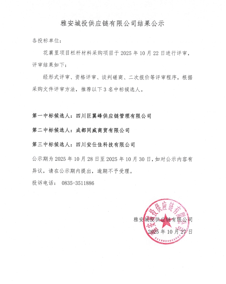 雅安城投供應(yīng)鏈有限公司花襄里項目欄桿材料采購結(jié)果公示